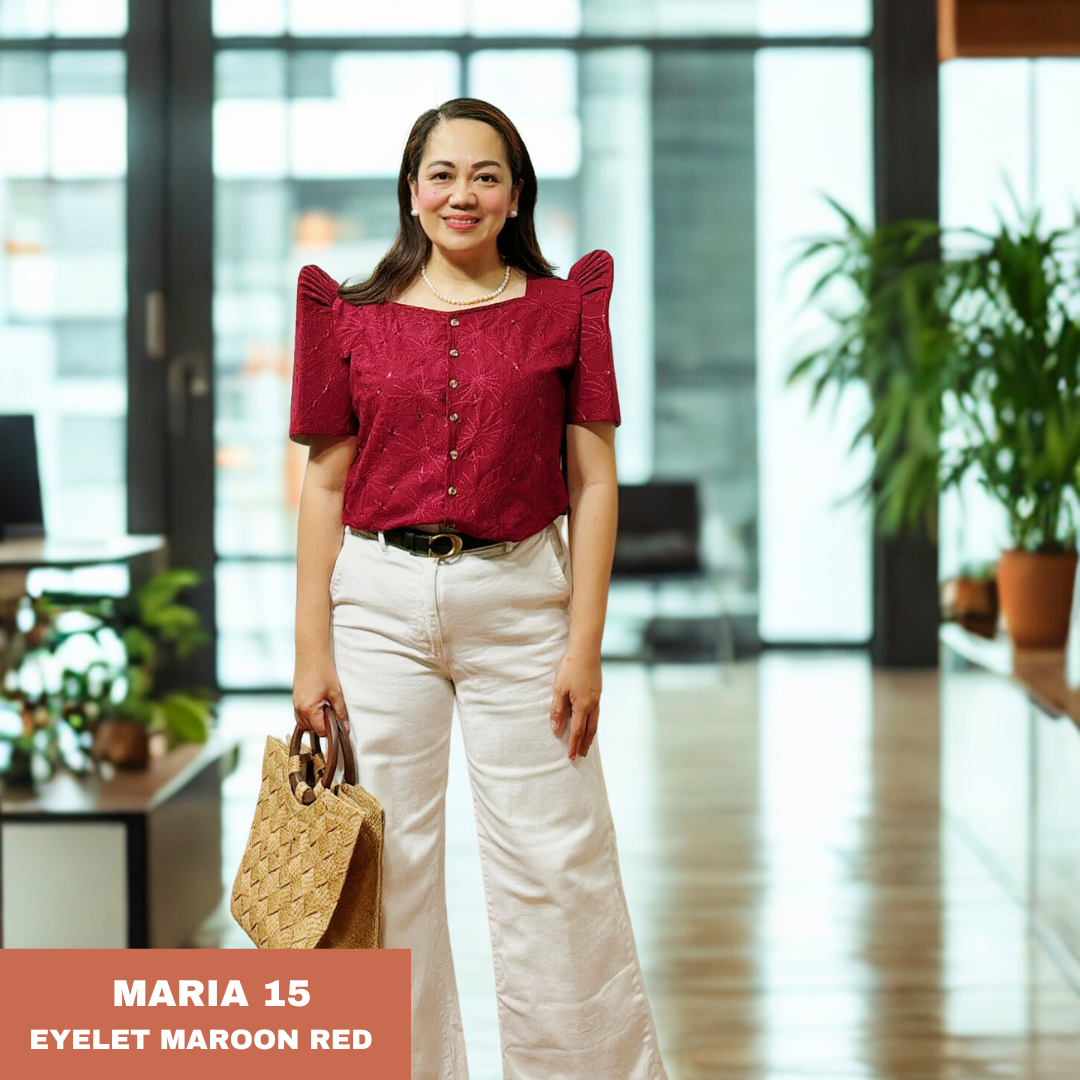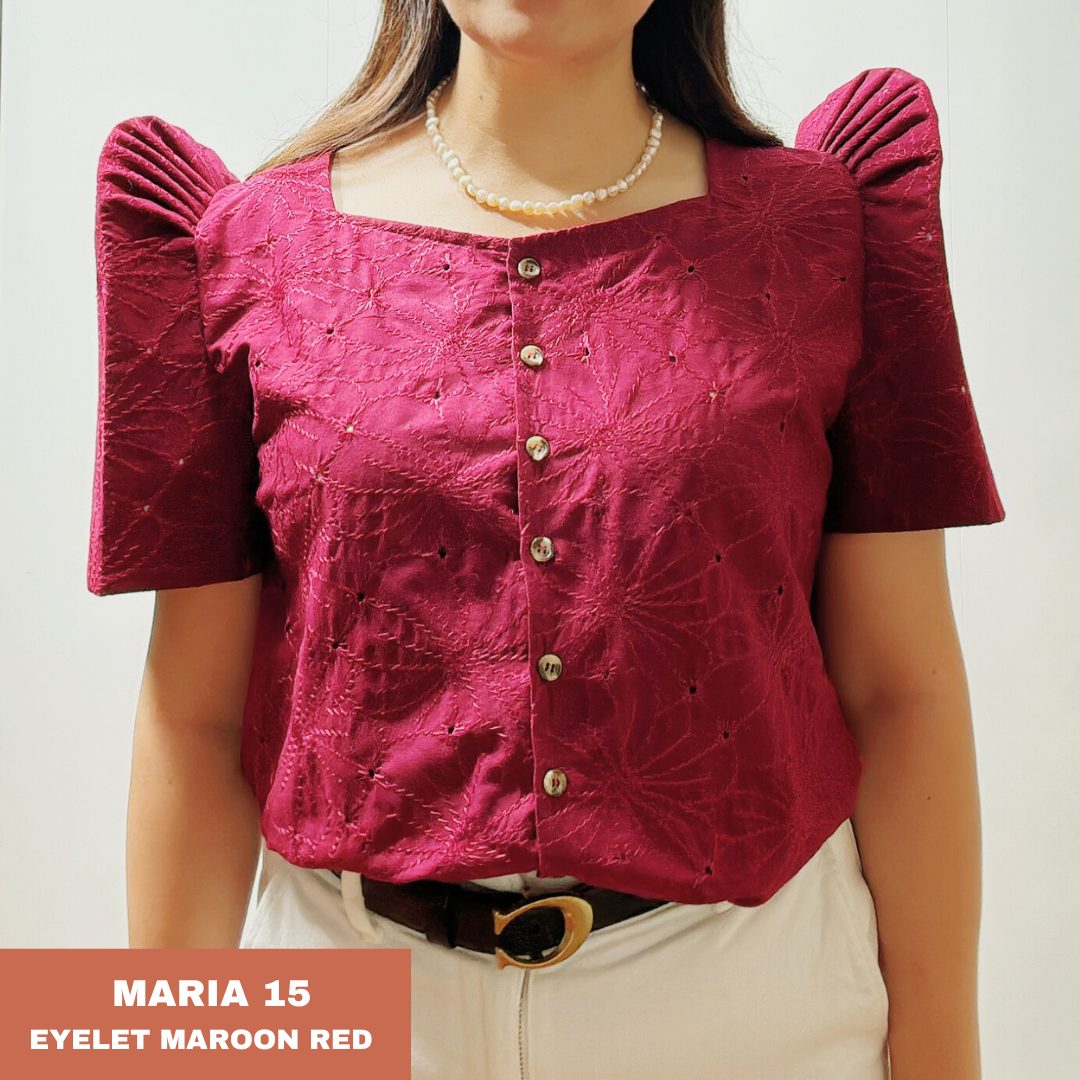 Elevate your wardrobe with the MARIA  Filipiniana Blouse, a modern take on a timeless classic. Made from premium eyelet fabric  , this blouse offers all-day comfort while exuding sophistication.